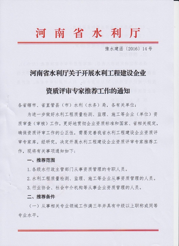 關于開展水利工程建設企業(yè)資質評審專家推薦工作的通知